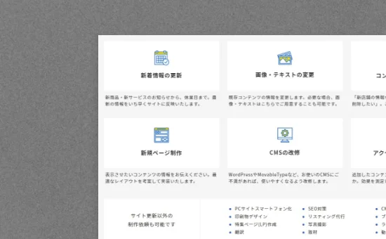 既存クライアントからの問い合わせや要望に対するメール・電話対応が主な業務となります。サイト公開後の関係継続、疑問などへ寄り添うことで、顧客満足度の向上や追加受注を目指します。エムハンドでは、納品後の問い合わせ対応窓口としてカスタマーサポートが対応し、お客様のサイト更新作業をサポートします。